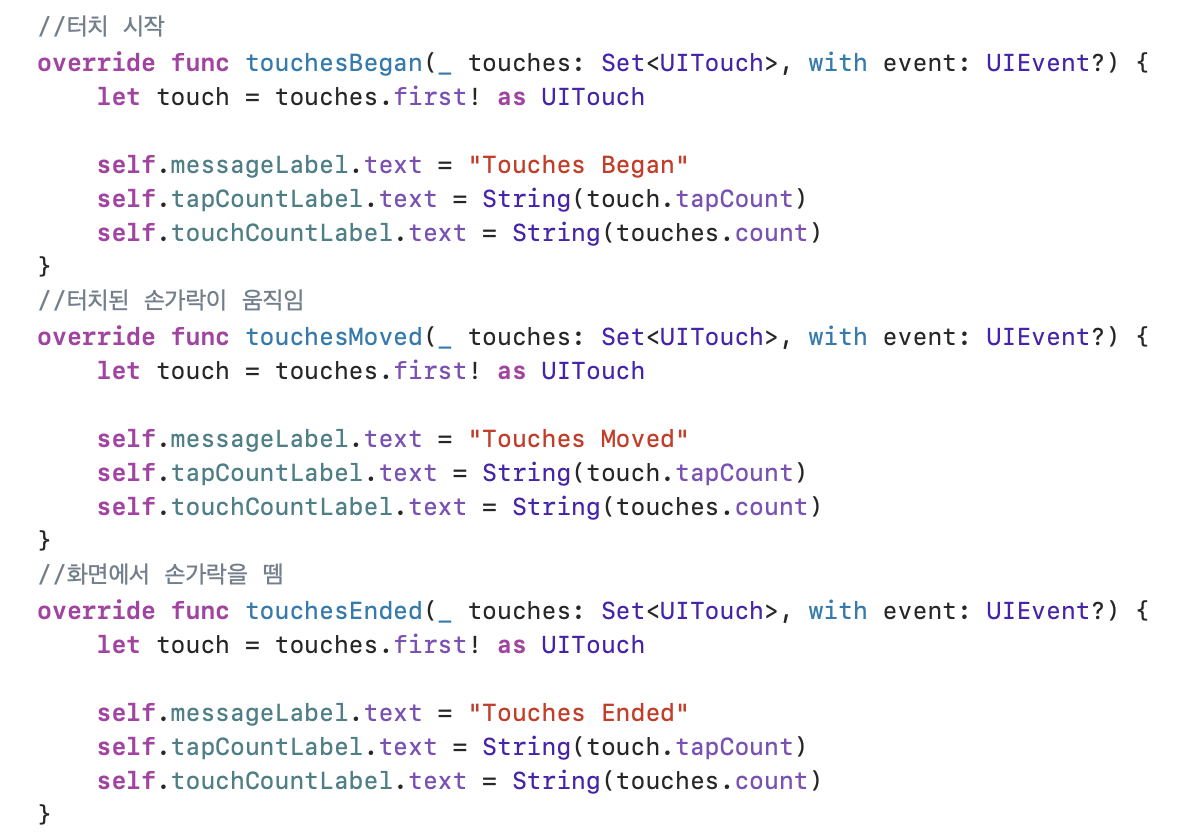 - began์ ํฐ์น๋ฅผ ์์ํ ๋, moved๋ ๋๋๊ทธํด์ ์์ง์ผ ๋, ended๋ ์์ ๋ ๋, canceled๋ ํฐ์น๊ฐ ์ทจ์๋ ๋ ์ด๋ฒคํธ๊ฐ ๋ฐ์