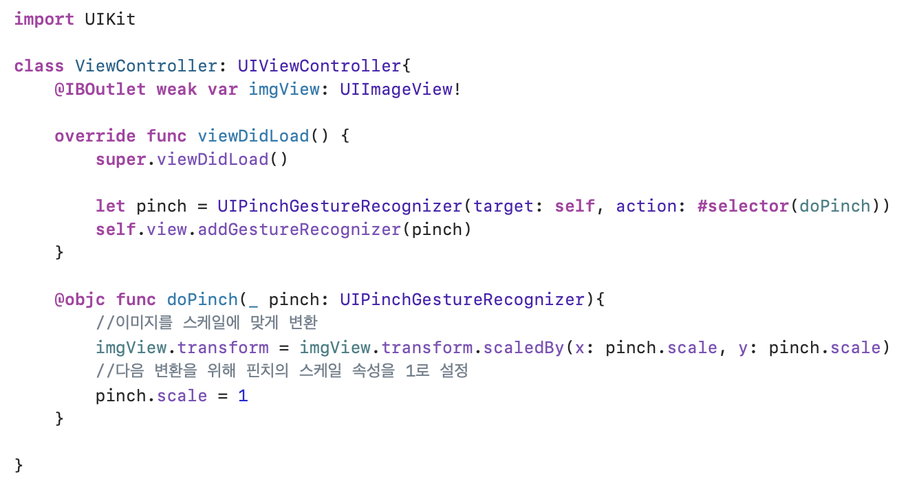 UIPinchGestureRecognizer ํด๋์ค ์์ pinch๋ฅผ ์ ์ธํ๋ค. ํ์น ์ ์ค์ฒ๊ฐ ์ธ์๋์์ ๋ ์คํํ ๋ฉ์๋๋ doPinch๋ก ์ค์ ํ๋ค.
