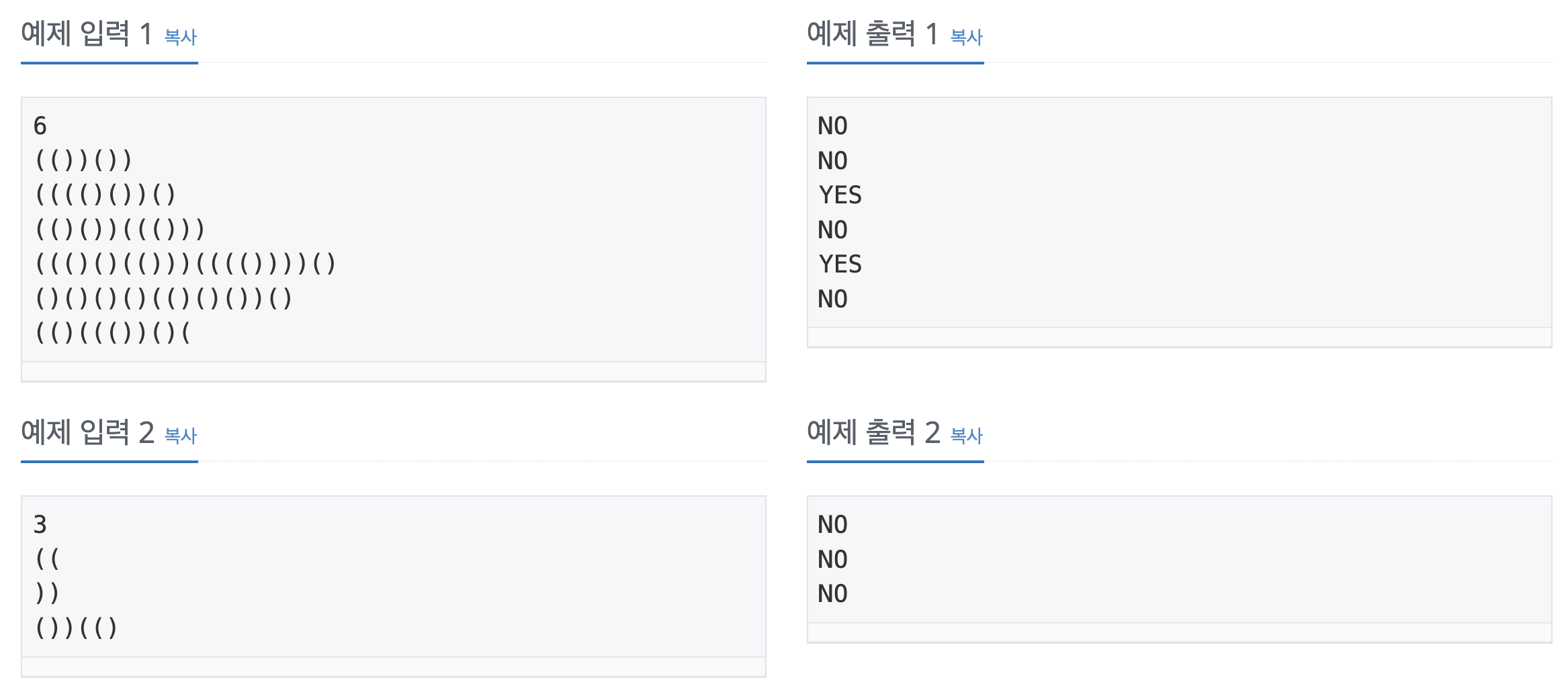 ์ถ๋ ฅ์ ํ์ค ์ถ๋ ฅ์ ์ฌ์ฉํ๋ค. ๋ง์ผ ์ ๋ ฅ ๊ดํธ ๋ฌธ์์ด์ด ์ฌ๋ฐ๋ฅธ ๊ดํธ ๋ฌธ์์ด(VPS)์ด๋ฉด “YES”, ์๋๋ฉด “NO”๋ฅผ ํ ์ค์ ํ๋์ฉ ์ฐจ๋ก๋๋ก ์ถ๋ ฅํด์ผ ํ๋ค.