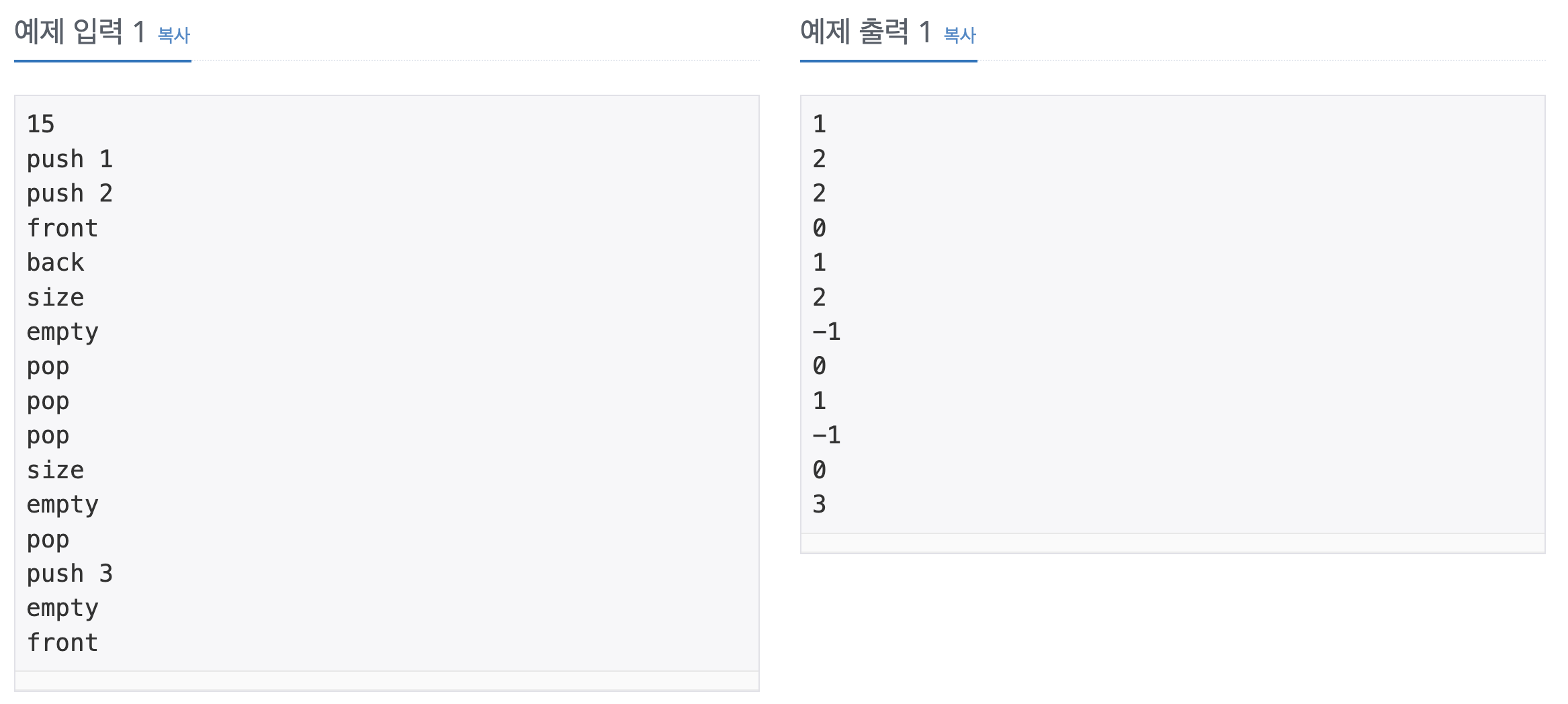 - front: ํ์ ๊ฐ์ฅ ์์ ์๋ ์ ์๋ฅผ ์ถ๋ ฅํ๋ค. ๋ง์ฝ ํ์ ๋ค์ด์๋ ์ ์๊ฐ ์๋ ๊ฒฝ์ฐ์๋ -1์ ์ถ๋ ฅํ๋ค.