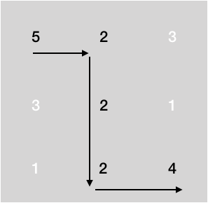 ์ฒซ ๋ฒ์งธ ์์ ์ ๊ฒฝ์ฐ ๋ค์๊ณผ ๊ฐ์ด ์ด๋ํ๋ฉด ์ง๋๋ ๊ฒฝ๋ก์ ์ ํ์๋ ์ซ์๋ค ์ค ์ต์๊ฐ์ด ๊ฐ ๋๋ฉฐ, ๋ ํฌ๊ฒ ๋ต์ ๋ง๋ค ์๊ฐ ์์ต๋๋ค.