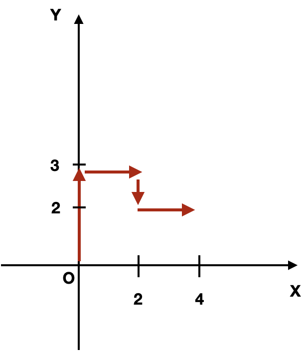 ์๋ก 3์นธ, ์ค๋ฅธ์ชฝ์ผ๋ก 2์นธ, ์๋๋ก 1์นธ ์ด๋ ํ ์ค๋ฅธ์ชฝ์ผ๋ก ๋ค์ 2์นธ ์ด๋ํ๋ฉด ์ต์ข ์์น๋ (4, 2)๊ฐ ๋ฉ๋๋ค