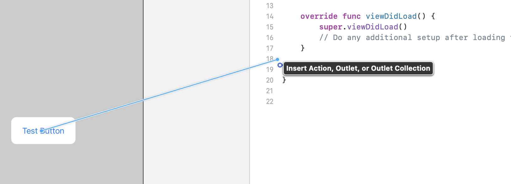 Button ๊ฐ์ฒด๋ฅผ ๋ง์ฐ์ค ์ค๋ฅธ์ชฝ ๋ฒํผ์ผ๋ก ์ ํํ๊ณ , ๋ณด์กฐ ํธ์ง๊ธฐ ์์ญ์ผ๋ก ๋๋๊ทธํ์ฌ ํด๋์ค ๋งจ ๋ง์ง๋ง ๋ถ๋ถ์ ํด๋น ๊ฐ์ฒด๋ฅผ ๋์ด๋ค ๋์ผ๋ฉด ๋ฉ๋๋ค. ๋ค์๊ณผ ๊ฐ์ด ์ฐ๊ฒฐ์ ์ด ๋ํ๋๊ณ , 'Insert Action, Outlet or Outlet Collection'์ด๋ผ๋ ํ์๊ฐ ๋์ต๋๋ค.