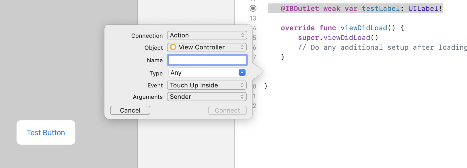 ๋ณ์๋ช ์ tapTestButton์ผ๋ก ํ๊ณ Type์ UIButton์ผ๋ก ์ ํํ๋ฉด ๋ค์๊ณผ ๊ฐ์ ์์ค์ฝ๋๊ฐ ์ถ๊ฐ๋ฉ๋๋ค.