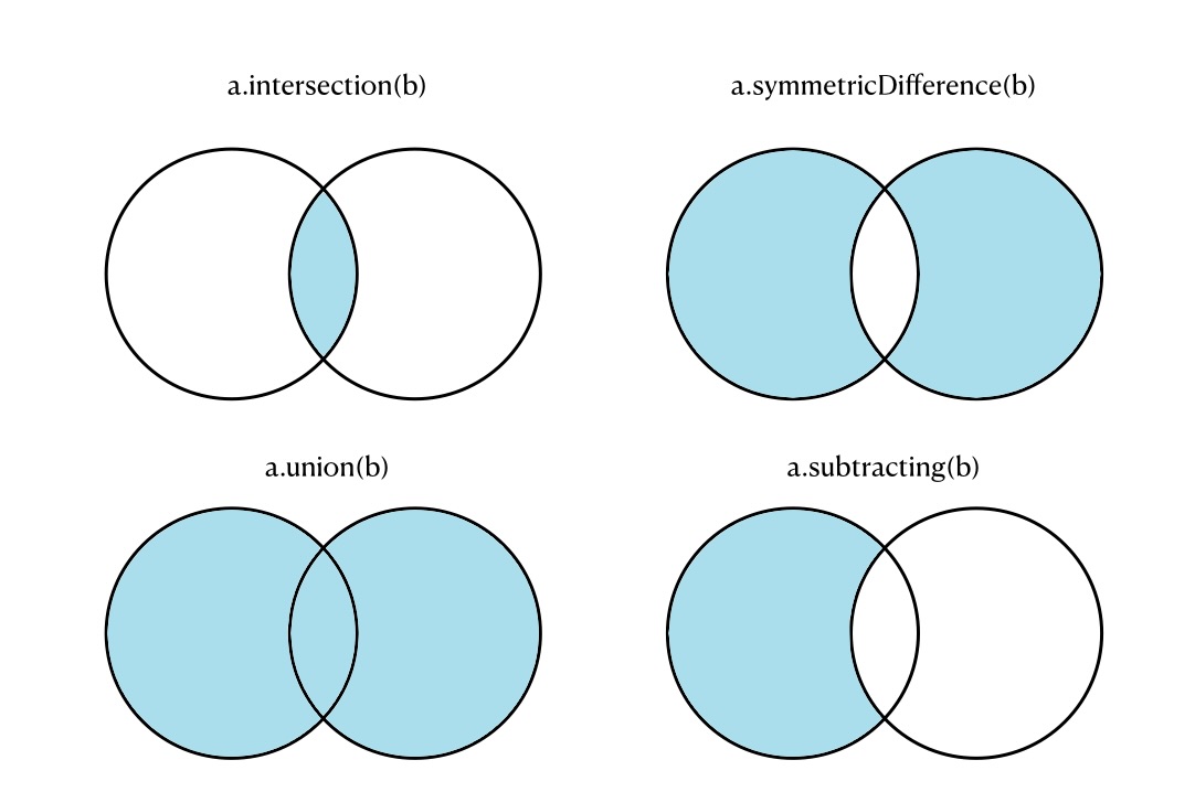 count setμ νλͺ©μ κ°μ λ°ν isEmpty setμ΄ λΉμ΄μλμ§ νμΈ insert(value) setμ κ° μΆκ° remove(value) setμμ κ° μμ contains(value) setμ κ°μ΄ μ‘΄μ¬νλμ§ νμΈ intersection(b) set bμ κ°μ μμλ€λ§ λ°ν, κ΅μ§ν© union(b) set bμ μμμ setμ μμ λͺ¨λ λΆλΆ λ°ν, ν©μ§ν© symmetricDifference(b) set bμ μμμ setμ μμμμ κ°μ μμλ§ λΉΌκ³ λ°ν subtracting(b) setμ μμμμ set bμ κ°μ μμλ§ λΉΌκ³ λ°ν