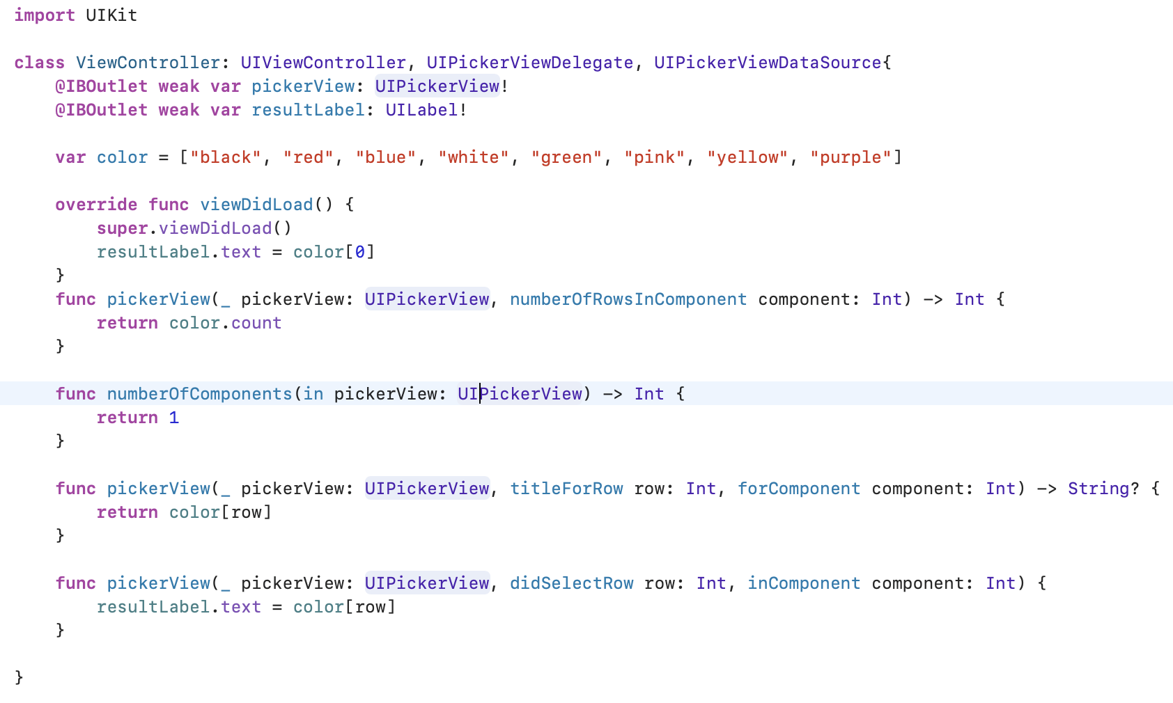 - didSelectRow: PickerView์์ ์ ํ๋์์ ๋ ๋์ํ ๊ตฌ๋ฌธ ์์ฑ