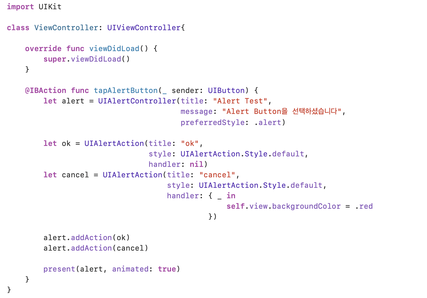 AlertController์ Action ์ถ๊ฐ ํ present ๋ฉ์๋ ์คํ