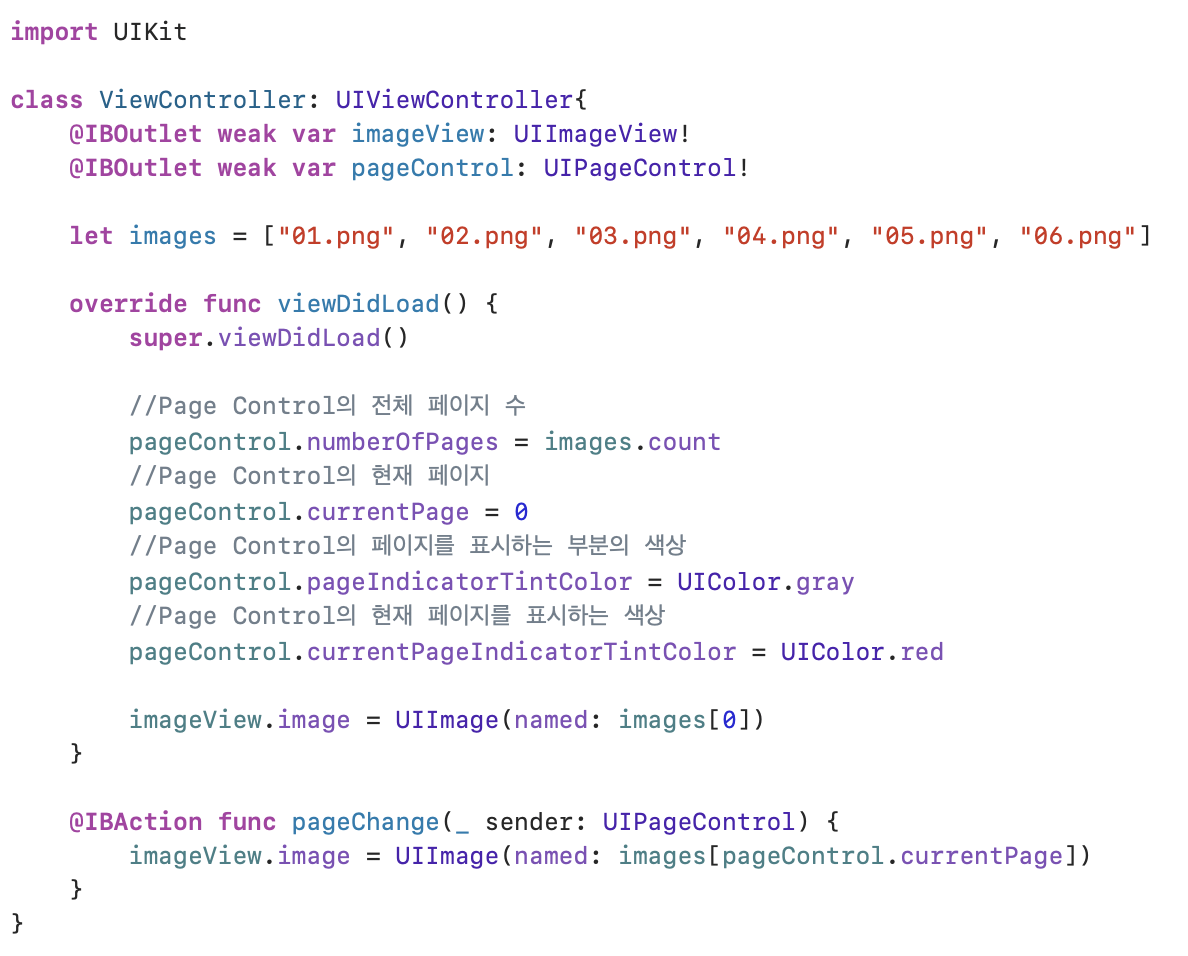 Page Control์ ํ์ด์ง ์, ํ์ฌ ํ์ด์ง, ์์์ ์ค์ ํ ํ image View์ ํ์ฌ ํ์ด์ง์ ์ด๋ฏธ์ง ์ถ๋ ฅ