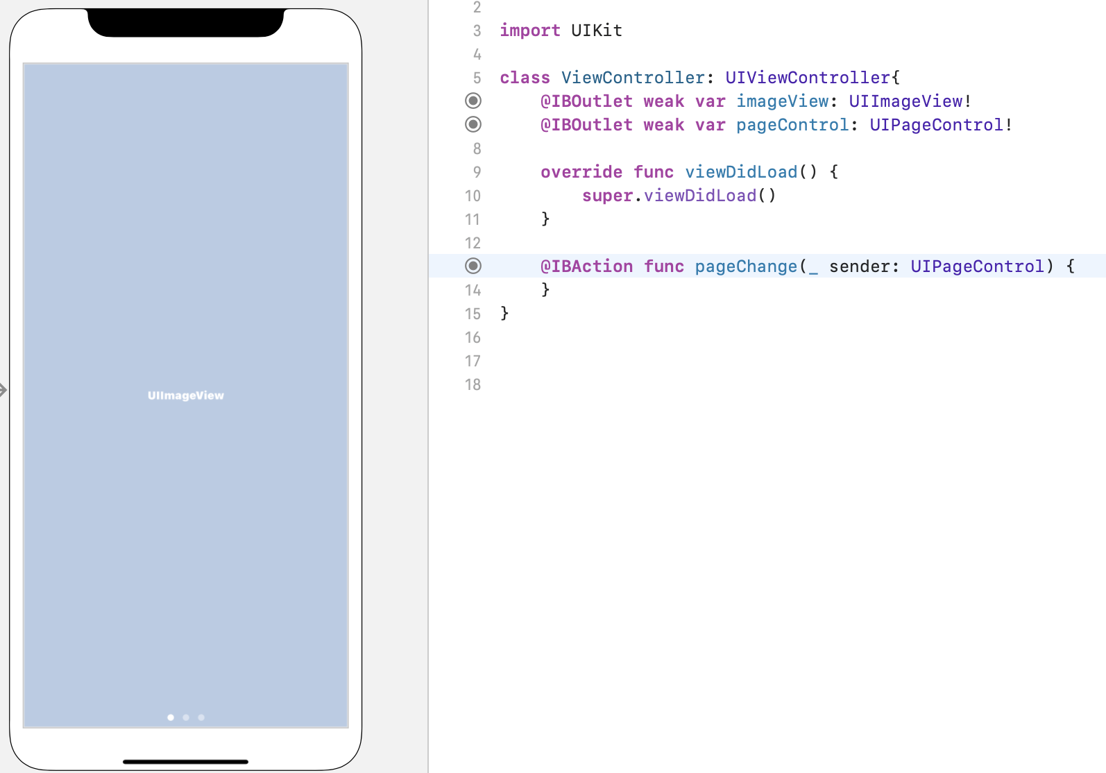 Page Control์ ํ์ด์ง ์, ํ์ฌ ํ์ด์ง, ์์์ ์ค์ ํ ํ image View์ ํ์ฌ ํ์ด์ง์ ์ด๋ฏธ์ง ์ถ๋ ฅ